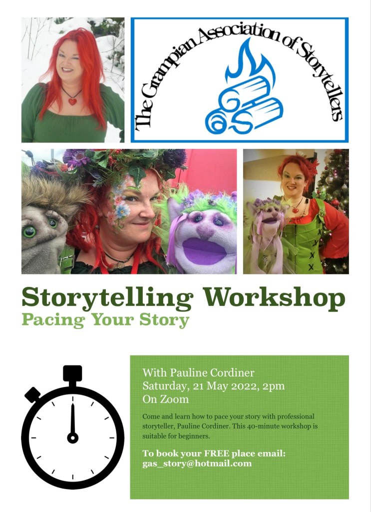A week on Saturday (That’s the 21st May!) I’m going to be talking about Pacing Your Story at this The Grampian Association of Storytellers – GAS workshop. It’s the third in a series of three workshops for beginners (the first two having been ran by Diana Peers of Once Upon A Tune and Jackie Ross of JackieTales and Doric Books) but there is still time for you to join up for this one!