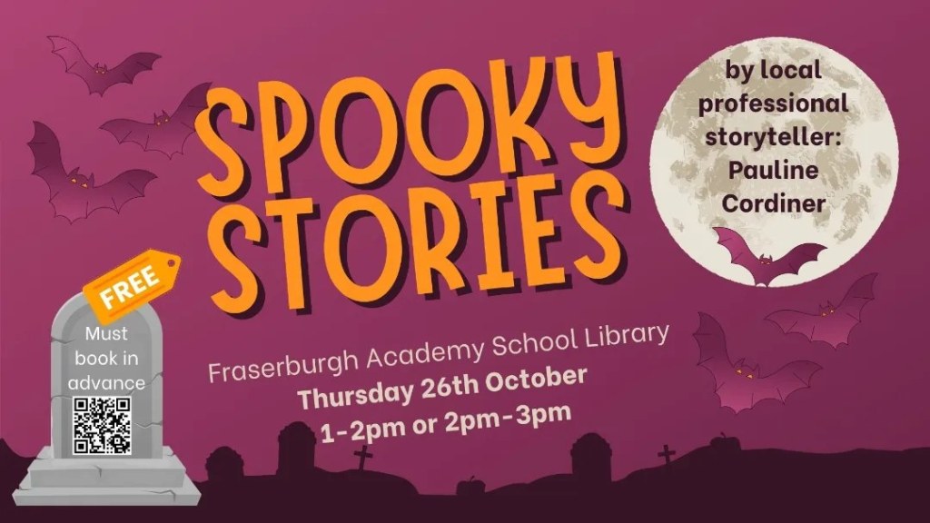“Pauline Cordiner, A Scottish Storyteller is returning to Fraserburgh Academy Library on Thursday 26th of October to tell spooky stories. Are you brave enough to come and listen?