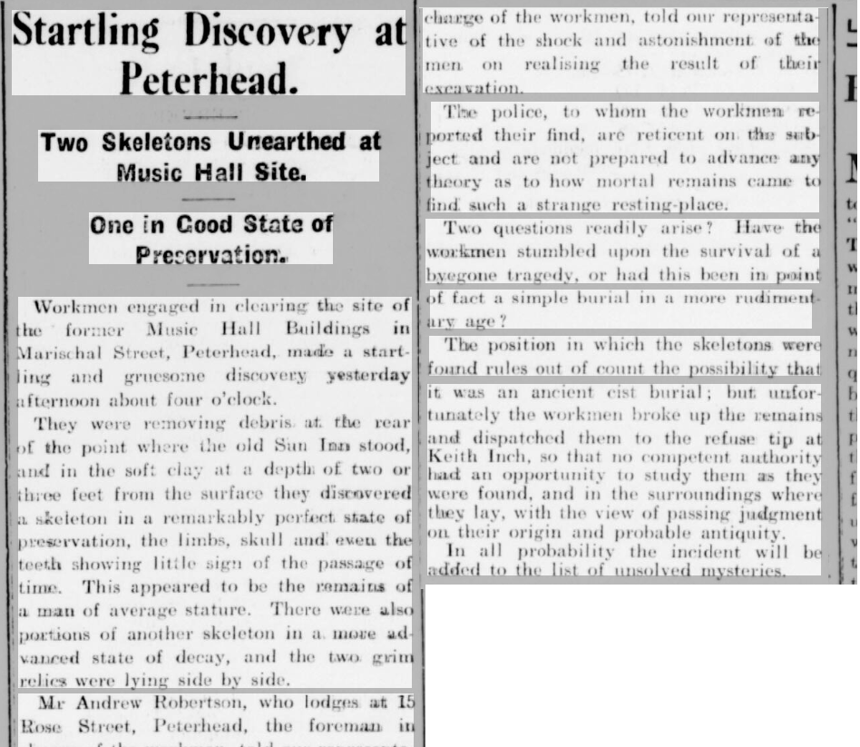 The question was – what happened to the skeletons? Where were they buried? I was half way through writing an email to the Aberdeenshire Burial Admin and thought I’d attach a newspaper clipping or two for context. Re-reading this one from the Buchan Observer and Aberdeenshire Advertiser (21st June 1939) it seems that the skeletons were unceremoniously “dispatched to the refuse tip at Keith Inch” !!
