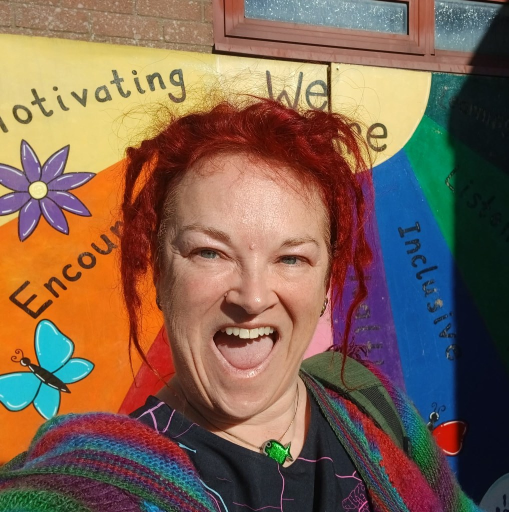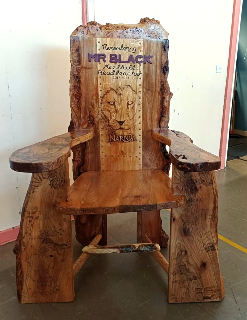 I also got to see the school’s Storytelling Chair for the first time. (First photo) It was made by the folks at HMP Grampian in memory of Mr Black, who was the headteacher until 2024. there are amazing images from childrens’ books all over it and… some of my favourite Doric words!