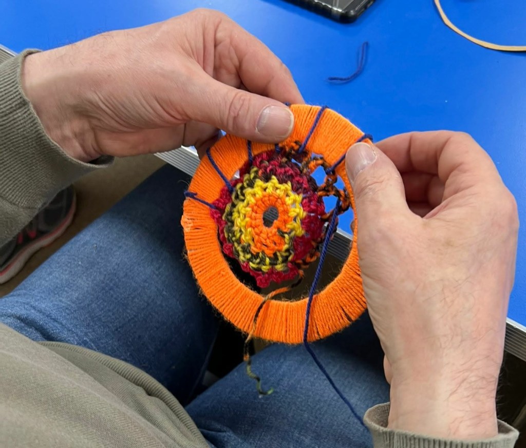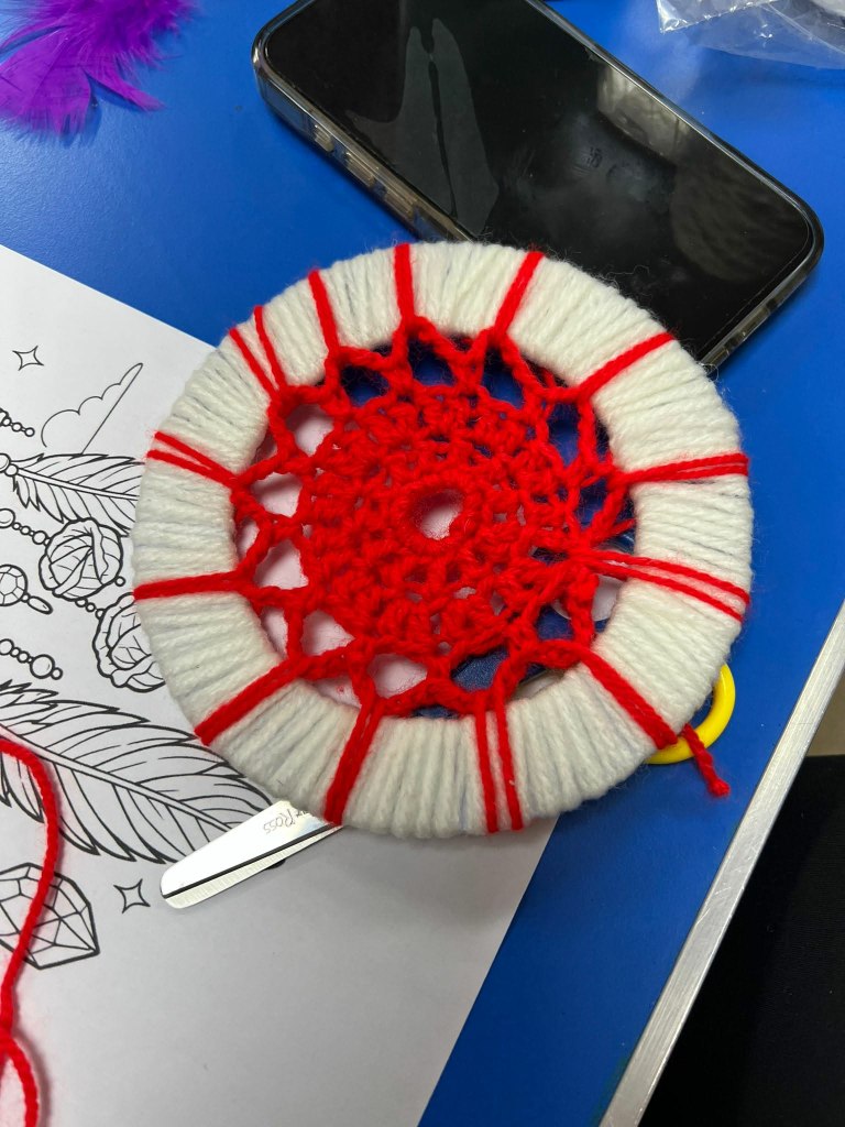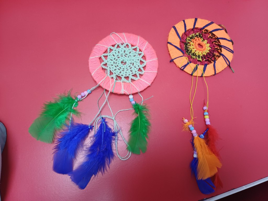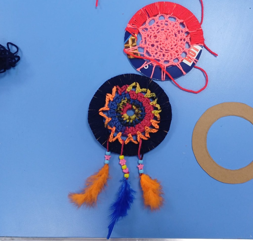 Making dreamcatchers looks tricky the traditional way – luckily M had been busy crocheting all weekend (I did have a go! Mine is the neon pink doily in the second photo!) to create the centres in these cardboard disc dreamcatchers.