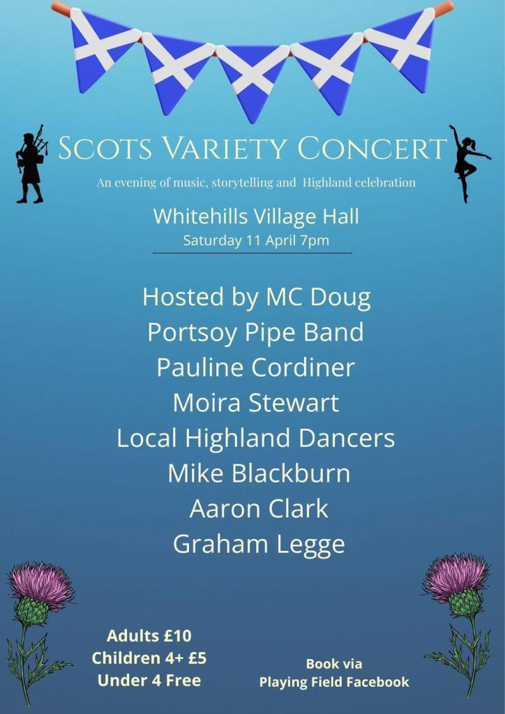 I’m also chuffed tae be takkin part in the Scots Variety Concert in the Whitehills Village Hall at 7pm. I’ll be in fine company wi Doug Hay, Moira Stewart, the Portsoy Pipe Band, local highland dancers, Mike Blackburn, Aaron Clark and Graham Legge! ![]()