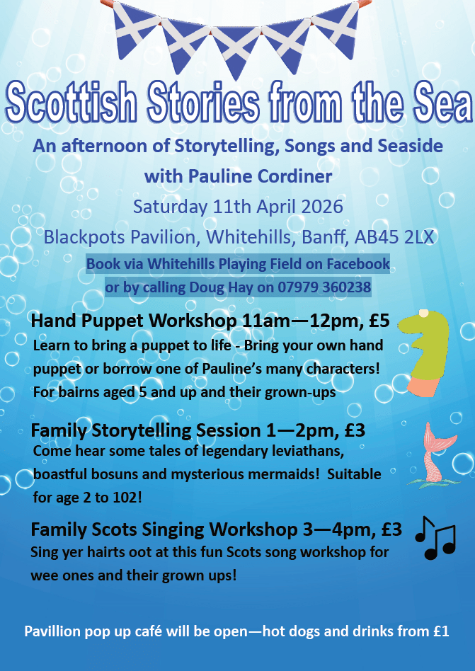 Coming up on Saturday 11th April! I’m going to be running a Hand Puppet Workshop, Family Storytelling Session and a Family Scots Song Workshop – all at the Blackpots Pavilion in Whitehills!