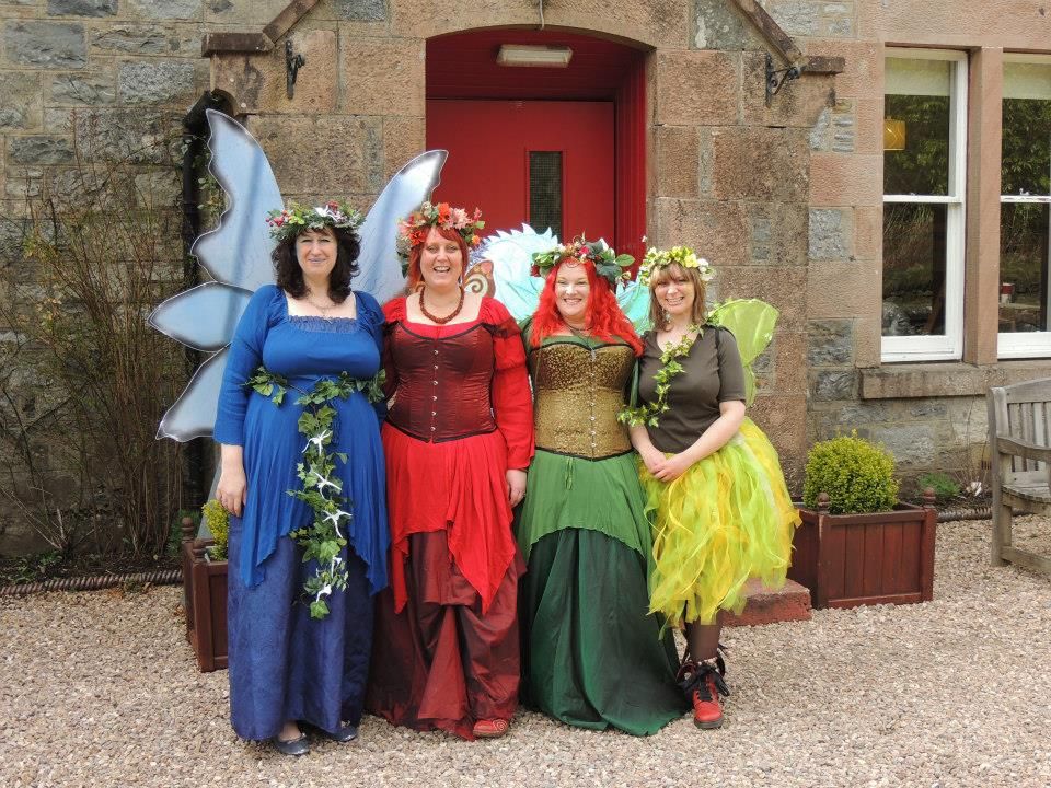 And… at the end of April The Rhynie Wifies were booked to do their first wedding! We leapt at the chance to dress as the fairies of Spring, Summer, Autumn and Winter and sang and told stories to entertain the wonderful bride, groom and guests.